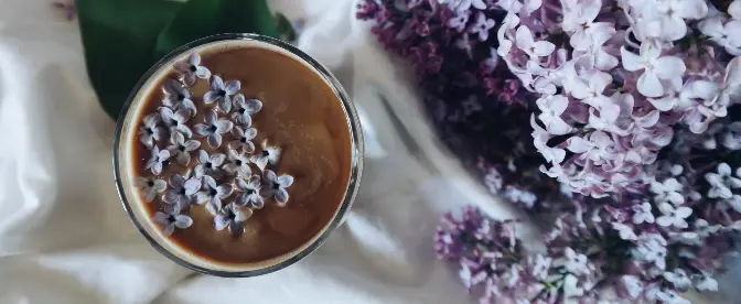 Häll på den ångade mjölken och toppa drycken med lite skum. Avsluta vispad grädde och strö över några lavendelblad till garnering.